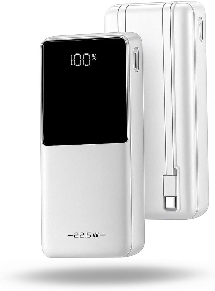 Power Bank Carregador portátil 10000mAh com Carregamento Turbo 22.5W, Saída Rápida Tipo-C e Lightning Integrados, Compatível com Android e iPhone, Cabo Embutido e Visor Digital de Carga (Branco)