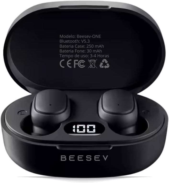 Fone de Ouvido Bluetooth 5.3 TWS Sem Fio Wireless Com Visor Graves Potente Compatível com iOS e Android, Beesev-ONE (Preto)
